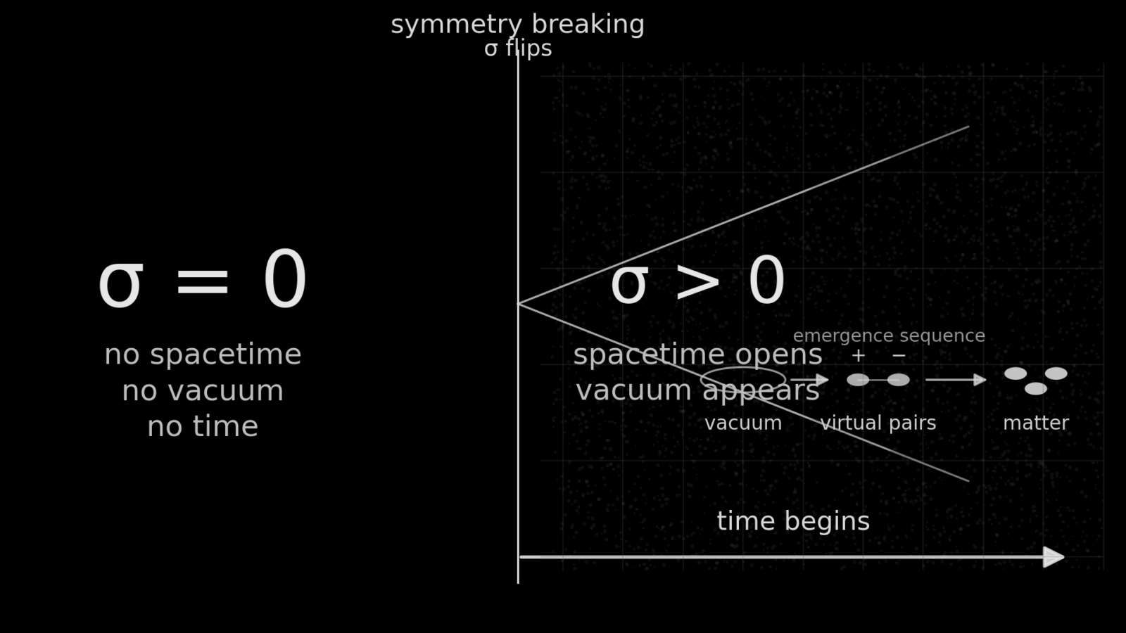 In this picture, the vacuum that appears after σ flips is not an absolute “nothing,” but a fragile baseline full of potential. Once symmetry breaks and σ acquires a value, spacetime, time and structure tumble out. Such an idea resonates with the language of spontaneous symmetry breaking in high-energy physics, and with certain holographic approaches.